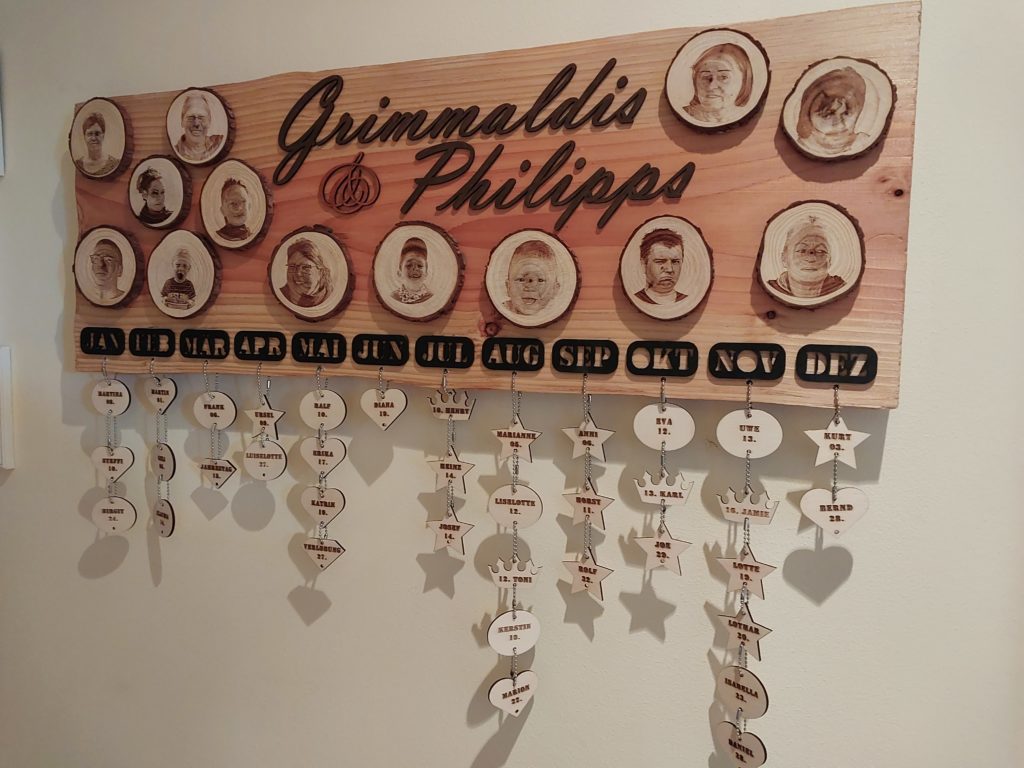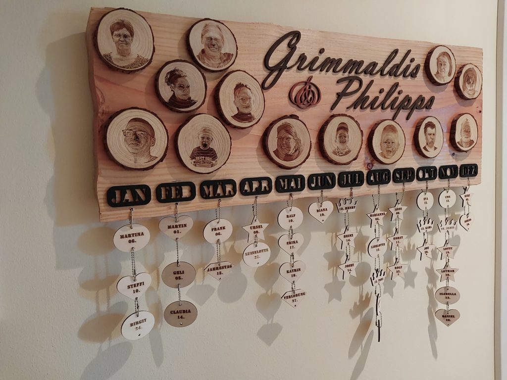 Beim Aufräumen im Garten lag da ein Brett aus Douglasie und es gab keine Verwendung dafür. Also musste die Denkmaschine 2 Tage rattern und rausgekommen ist der Familienkalender der Geburtstage. Der engste Kreis ist mit einer Fotogravur auf Kieferholzscheiben verewigt. Auf den hängenden Formen, steht er Tag und der Name des Familienmitglieds im jeweiligen Monat. Dabei haben die einzelnen Elemente verschiedene Formen. Sterne sind verstorbene Personen, Herzen sind Mitglieder 1. Grades, Kronen sind die Kinder, Ovale sind alle anderen Mitglieder.