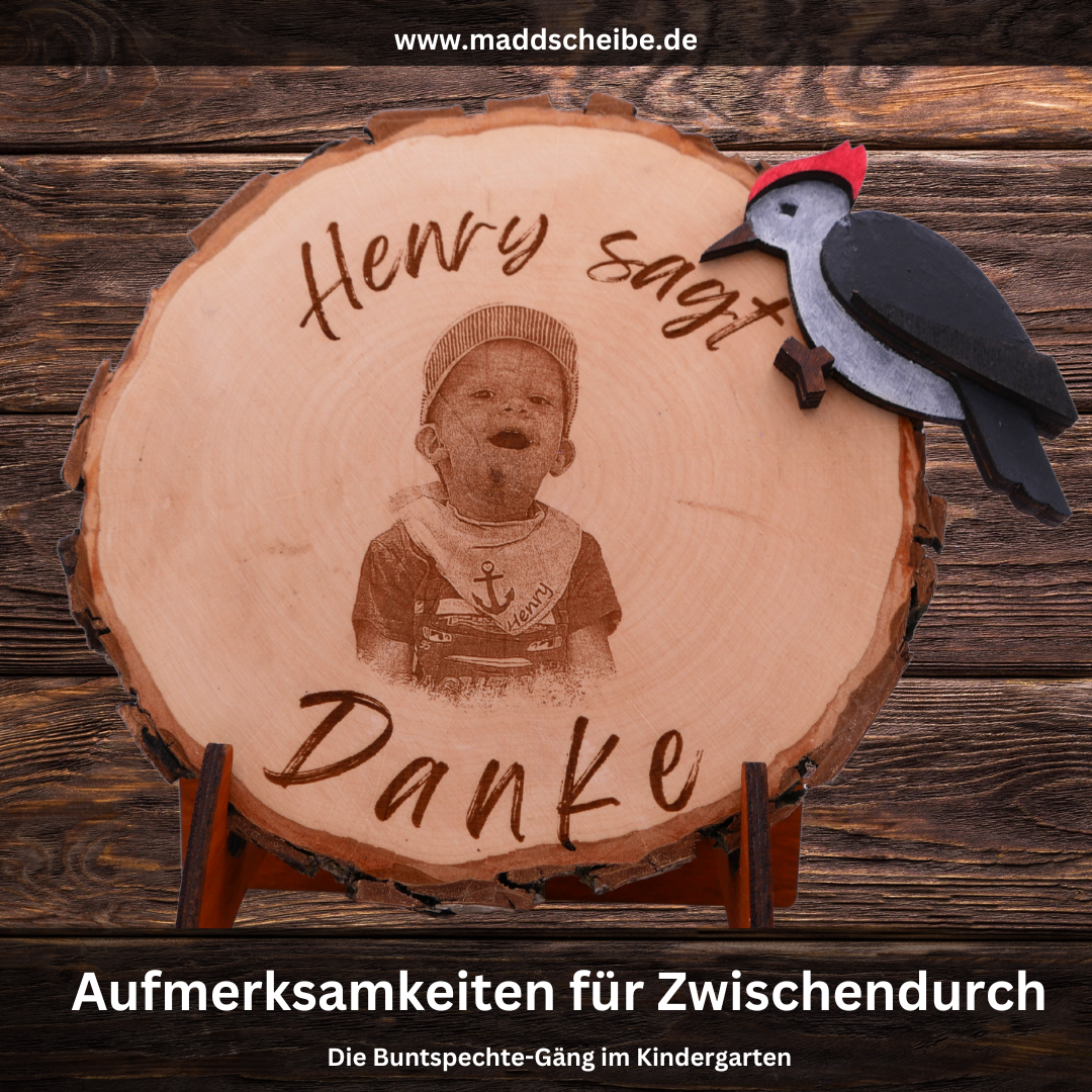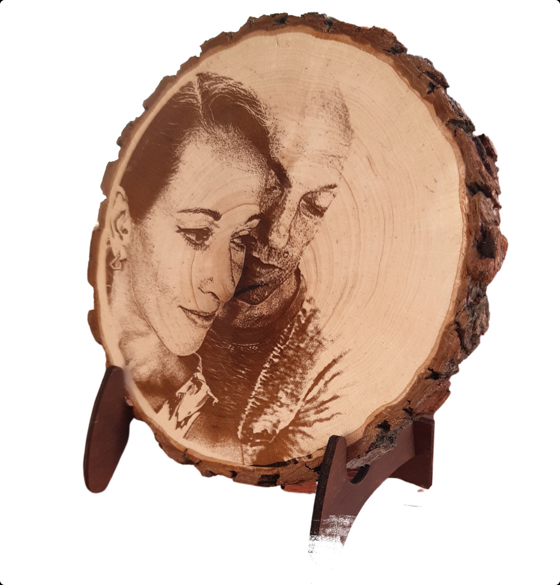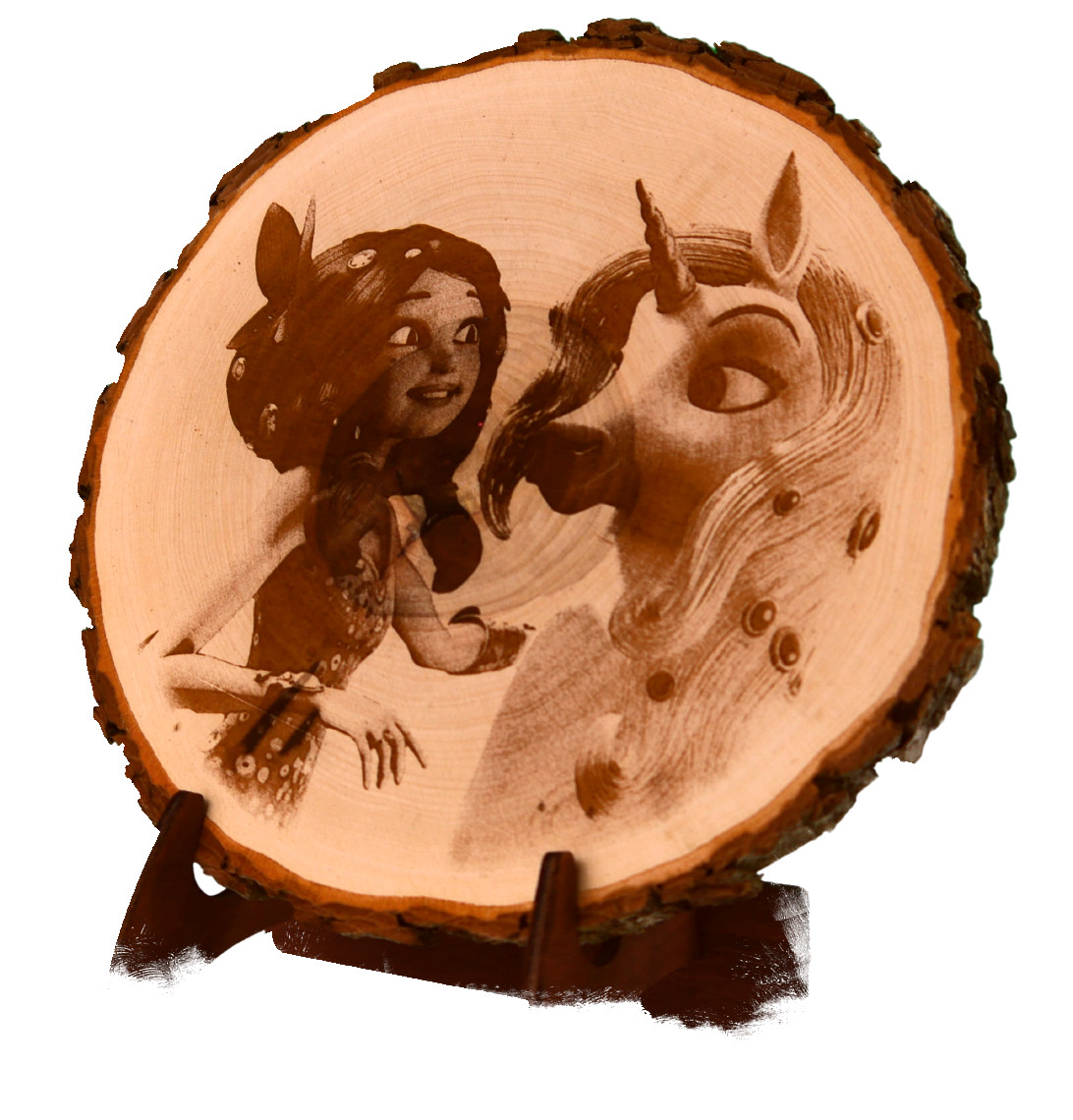 Diese Holzscheiben bestehen aus Erle und haben einen Durchmesser von 17 bis 21 cm und eignen sich perfekt für Fotogravuren. Auch Fantasy-Motive, wie die Holzscheibe mit Mia und Onchao sind möglich, die für eine kleine Dame zum Geburtstag gelasert wurde. Der Ständer ist individuell anpassbar und aus Sperrholz gelasert und mit Acrylfarbe bestrichen.